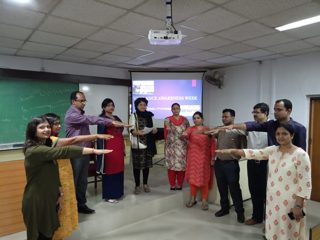 Vigilance awareness week was observed in Army Institute of Management, Kolkata (AIMK). The event was organized on 1 November 2019. The event started with the Integrity pledge on Vigilance by all the employees (Teaching, Non-Teaching ) and all the students. It was followed by video competition and Poster making Competition on issues related to the eradication of corruption in the society in which students participated in the event overwhelmingly. The guest of honor was Ms Poonam Mundhra, proprietor of PM consultants which deals with corporate branding and Manpower solutions, took a session on Vigilance Awareness on 1st November 2019. She explained the reasons as to why the vigilance week is celebrated and focused on the needs and benefits of being a vigilant person. She emphasized the qualities required for systematic improvements for wider dissemination and awareness for leading a good lifestyle. It was indeed an interactive session which proved to sensitize the students on major issues related to vigilance.