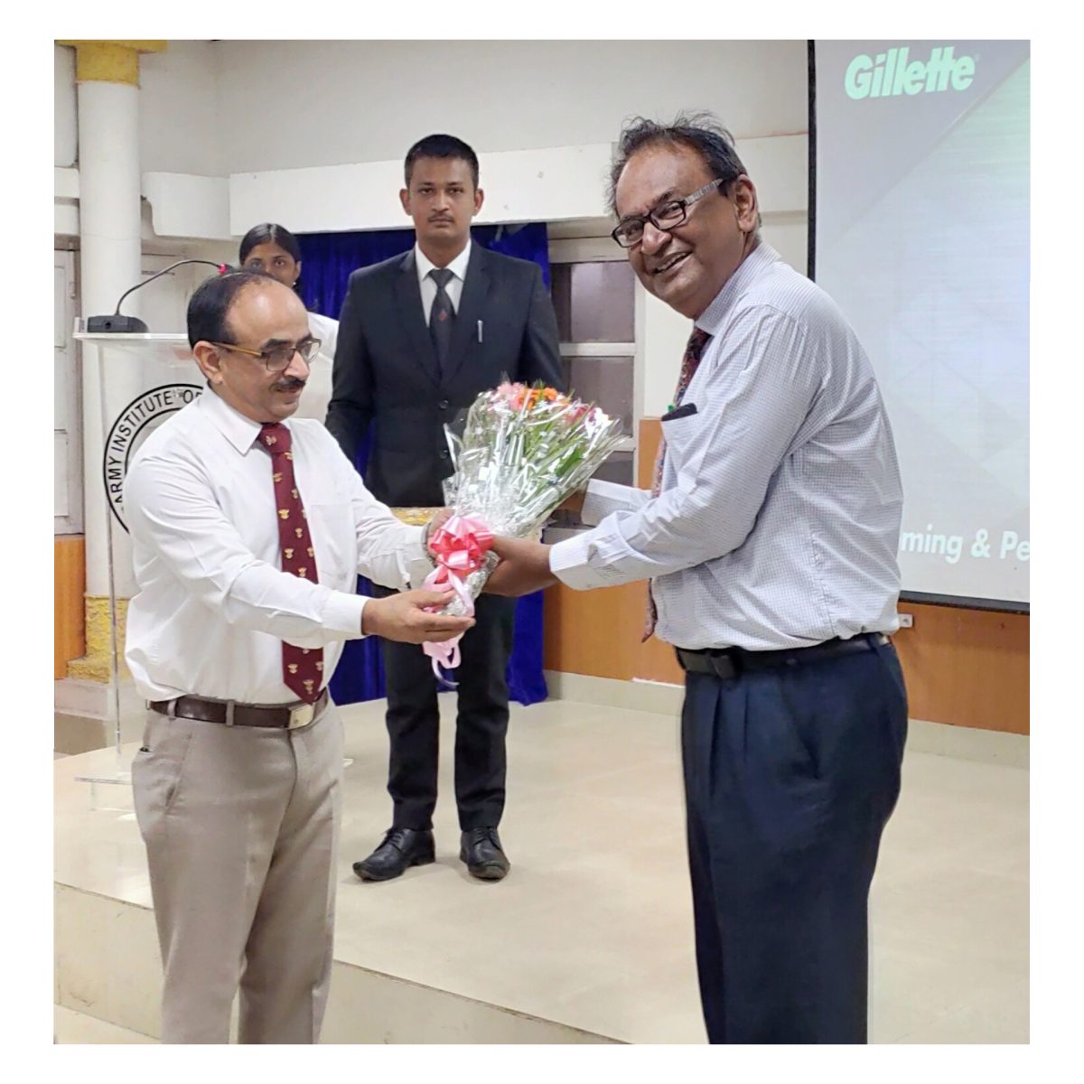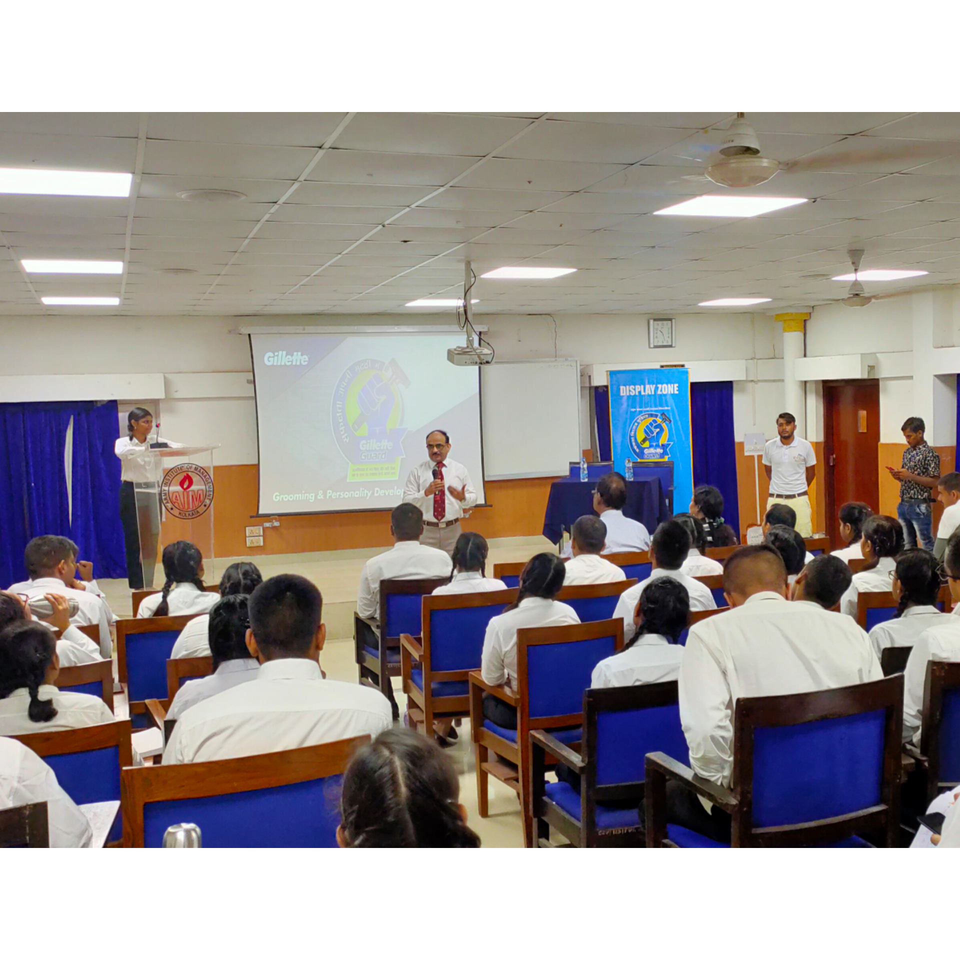 A workshop by Gillette was organised in Army Institute of Management Kolkata on Grooming and Personality development on 24 August, 2019 with motive of to help the students to gain knowledge on “How to develop a smart and confident personality” Mr. Somnath Ghosh, Sir told the students of MBA-23 about the facts and challenges for the job interviews in corporate world. He also told about the rule A.B.C, (Appearance, Body language, Communication Tips) and also showed us a video of how to shave properly and groom ourselves for an event. Nikhil Joshi and Ayushi Rai was selected as best groom of class by Mr. Somnath Ghosh Sir, and at the end few boys proceed to the shaving booth for their free shave, and whole batch to collect certificate of participation and Gillette Guard kit.